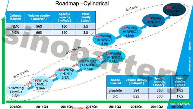 目前主流動力電池企業(yè)能量密度都已突破180wh/kg,以云度π1搭載的比克18650圓柱電池為例,其能量密度已經(jīng)接近250wh/kg。下圖是比克在圓柱電池體系的開發(fā)路線圖。