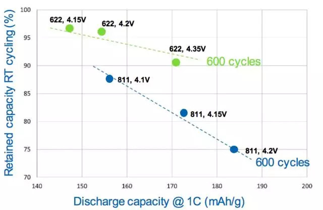 目前高電壓體系還是有一些問題沒有解決,比如對循環(huán)壽命的影響。以下是高Ni體系600次常溫循環(huán)后不同上限電壓的容量保持率對比。高溫循環(huán)衰減更為嚴重。