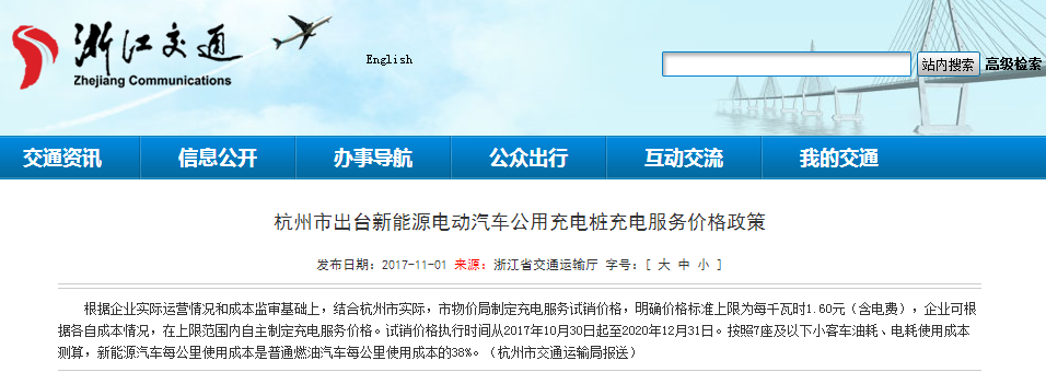 中國儲能網(wǎng)訊:11月1日,浙江省交通運(yùn)輸廳正式發(fā)布了《杭州市出臺新能源電動(dòng)汽車公用充電樁充電服務(wù)價(jià)格政策》,對杭州市新能源汽車公共充電樁價(jià)格進(jìn)行了規(guī)定。政策表明,根據(jù)企業(yè)實(shí)際運(yùn)營情況和成本監(jiān)審基礎(chǔ)上,結(jié)合杭州市實(shí)際,市物價(jià)局制定充電服務(wù)試銷價(jià)格,明確價(jià)格標(biāo)準(zhǔn)上限為每千瓦時(shí)1.60元(含電費(fèi)),企業(yè)可根據(jù)各自成本情況,在上限范圍內(nèi)自主制定充電服務(wù)價(jià)格。試銷價(jià)格執(zhí)行時(shí)間從2017年10月30日起至2020年12月31日。按照7座及以下小客車油耗、電耗使用成本測算,新能源汽車每公里使用成本是普通燃油汽車每公里使用成本的38%。