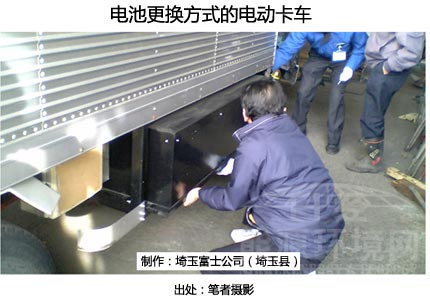 在日本,“改造電動(dòng)汽車”領(lǐng)域進(jìn)行著這種方式的嘗試。埼玉富士公司制作了采用電池更換方式的電動(dòng)卡車(載重2噸),并于2011年6月8日通過了車檢。媒體對(duì)其改造作業(yè)的情形也進(jìn)行了介紹。