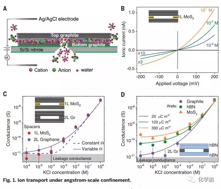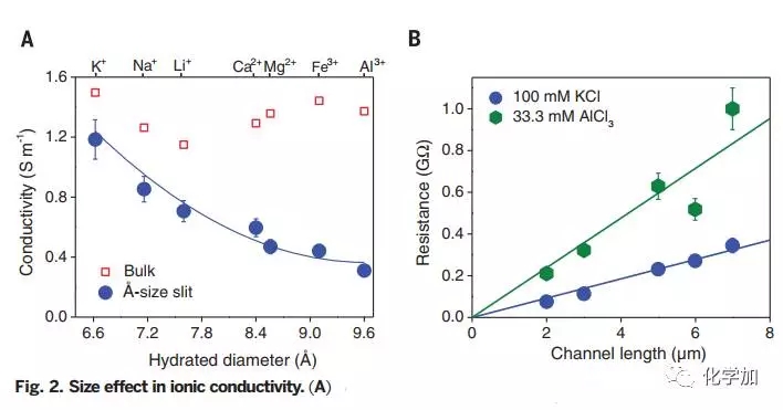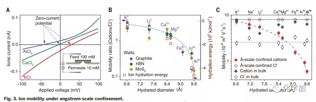 來(lái)自英國(guó)、中國(guó)的科研團(tuán)隊(duì)通過(guò)調(diào)控分子間范德華作用力,組裝得到具有原子級(jí)別光滑表面的石墨烯通道,僅兩層石墨烯厚度不同于準(zhǔn)一維納米管和生物通道,這種二維納米通道化學(xué)穩(wěn)定性良好,其高度潔凈表面使得通道表面電荷密度較此前文獻(xiàn)報(bào)道值低3-4個(gè)數(shù)量級(jí),可以阻隔水合直徑>13 ?的離子,這可以通過(guò)位阻效應(yīng)予以解釋。