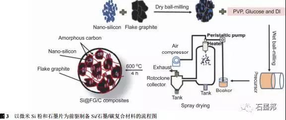 Cao等利用商品納米Si粉和石墨片為原料, 結(jié)合機(jī)械球磨、噴霧干燥技術(shù)以及高溫煅燒處理獲得納米Si/非晶碳/石墨復(fù)合材料,其中Si含量約為10%.圖3展示了制備過程的流程圖. 所得的最終樣品為石墨片、Si納米顆粒以及非晶碳組成的微米級顆粒, 如圖4所示.在 0.2 A?g?1的電流密度下, 首圈庫侖效率為74%,可逆比容量為587mA?h?g?1;在0.5 A?g?1的電流密度下循環(huán)300次可逆比容量保持為420 mA?h?g?1.