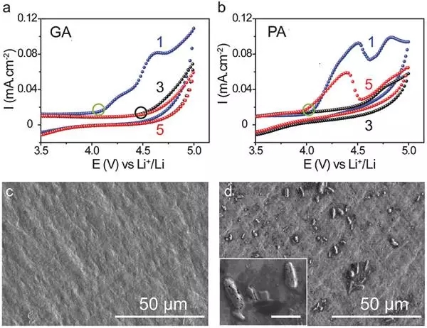 (d) LMO/PA 和LMO/GA電池的充放電曲線,實線和圓圈分別是LMO/PA 和LMO/GA電池;
