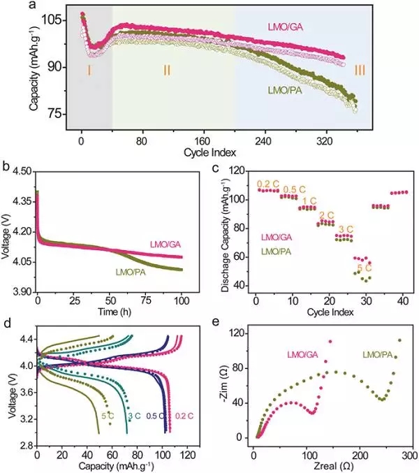 (a) LMO/PA 和 LMO/GA 電池的長時間低倍率循環(huán)性能,實心和圓圈分別是Ccha 和 Cdis;