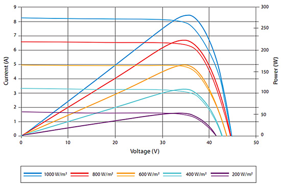 陰影遮擋對PR具有很大影響。如圖中所示,綠色曲線是無遮擋、光照正常的情況下,組件的功率特性曲線。紅色曲線是在陰影遮擋的時(shí)候,組件的功率特性曲線會(huì)出現(xiàn)多波峰的情況。