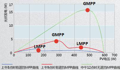 當(dāng)逆變器遇到這種情況(陰影遮擋)時(shí),如果逆變器沒有合適的“陰影掃描算法”,使用常規(guī)的算法會(huì)難以找到最大功率點(diǎn)。同時(shí),由于具有多個(gè)波峰,波峰高度不同,逆變器可能追到到最低的那個(gè)點(diǎn),系統(tǒng)損失相對更大。另外,盡管一些逆變器能夠在電壓范圍內(nèi)全局掃描追蹤最大功率點(diǎn),保證光伏系統(tǒng)的輸出。實(shí)際上最好的方案還是沒有陰影遮擋。