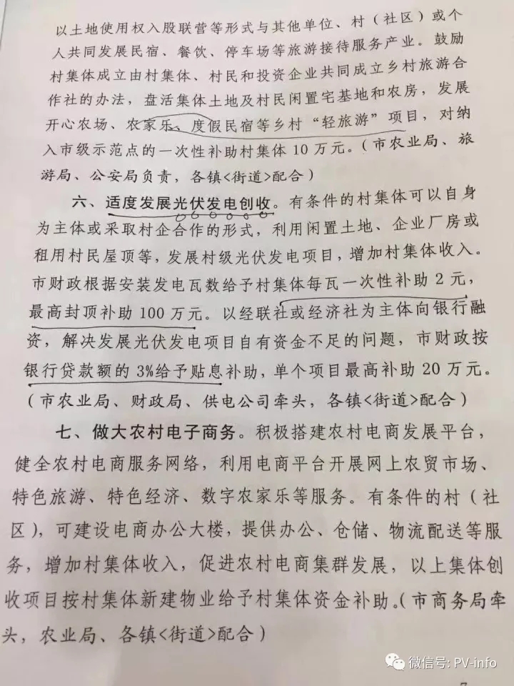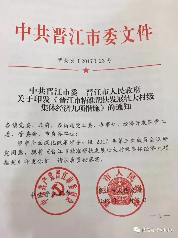中國儲能網(wǎng)訊:2017年11月2日晉江市委市政府聯(lián)合發(fā)布《晉江市精準(zhǔn)幫扶發(fā)展壯大村級集體經(jīng)濟(jì)九項措施》的文件,對晉江市光伏發(fā)電實行補(bǔ)助,村級光伏項目一次性補(bǔ)助2元/瓦,對于貸款部分,市級財政給予3%的貼息補(bǔ)助,相當(dāng)?shù)耐梁?,值得我們其他政府學(xué)習(xí)!