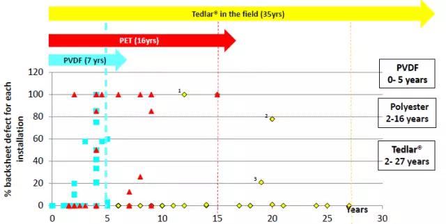 杜邦還對(duì)不同材料類型的背板及使用年限進(jìn)行了分析,結(jié)果顯示,基于Tedlar? PVF薄膜的背板是所有電站中使用最久、失效率最低的背板,而基于PVDF薄膜和PET的背板失效率較高,平均超過(guò)7%,且會(huì)隨著使用時(shí)間的增加而增加。
