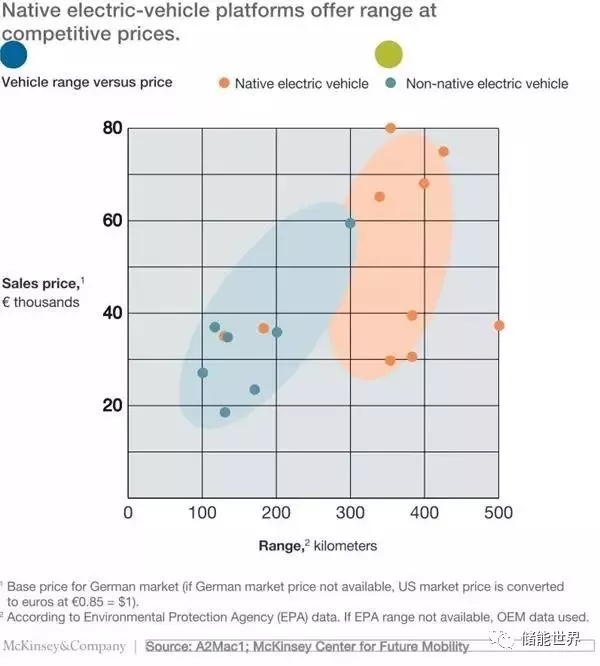 原生平臺具有最佳的電池裝配框架,而基于內(nèi)燃機車型的平臺僅僅是把電池塞進(jìn)去,這限制了其能量密度。相比之下,根據(jù)美國環(huán)保局的數(shù)據(jù),原生平臺的電池組可以采取簡單的矩形形狀,使每次充電后的最大續(xù)航里程可達(dá)兩倍(300公里以上),其中的佼佼者可達(dá)約400公里。這些續(xù)航里程的增加并不會增加車價。此外,比起同類使用內(nèi)燃機平臺的電動汽車或內(nèi)燃機汽車,搭載原生平臺的電動汽車的車內(nèi)空間也更大,增加了約10%左右。