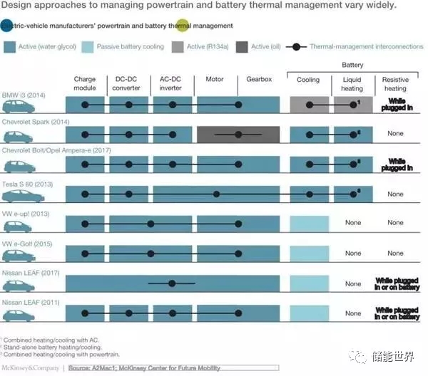 我們還發(fā)現(xiàn),熱管理系統(tǒng)一共采用了四種不同的電池冷卻解決方案,其中存在很大差異:被動自然空氣冷卻、主動式結(jié)合動力系統(tǒng)、主動式獨立電池、主動式結(jié)合空調(diào)電路。