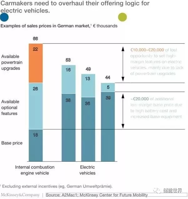 基本的電動汽車配置已經(jīng)包含了很多選裝件。由于電池成本高,電動汽車的基本價格也變高了,迫使原始設(shè)備供應(yīng)商在電動汽車的基本配置中加入比相應(yīng)內(nèi)燃機汽車更多的選裝件,這使得他們不再能達(dá)到以往的高邊際利潤率。