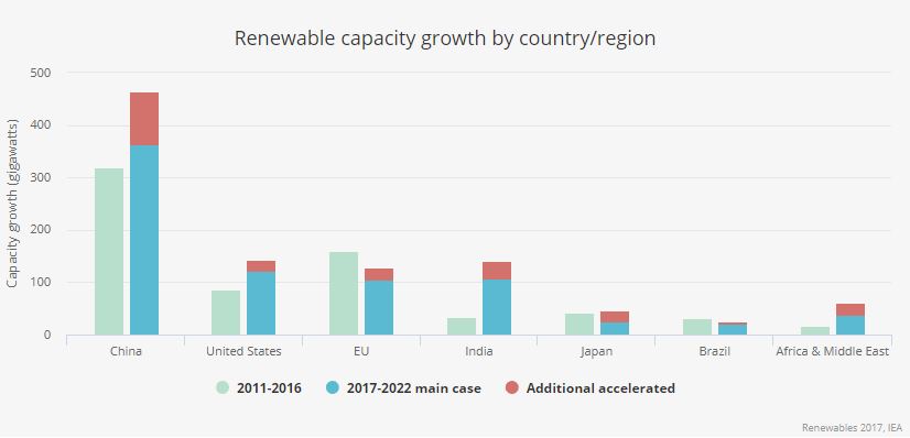 國際能源署(IEA)在2017年可再生能源報告中稱,中國已占全球太陽能電池制造總產(chǎn)能的60%,占全球光伏裝置使用和需求的50%。2016年,全球范圍光伏裝置的增長率首次超過其他能源載體,主要原因就是中國帶領(lǐng)美國和印度的光伏裝置增加。因此,中國的市場和政策變化,將影響到全球光伏裝置的供求與價格。