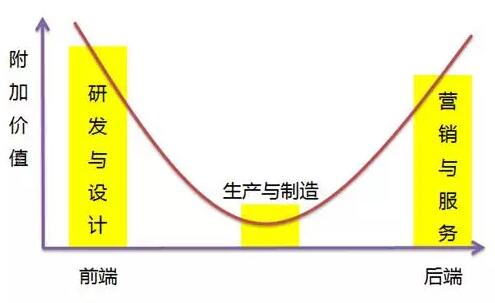 中國是制造業(yè)大國,但還遠(yuǎn)非制造業(yè)強(qiáng)國,隨著內(nèi)部和外部環(huán)境的不斷變化,中國的制造業(yè)也面臨著巨大的挑戰(zhàn)。從世界品牌實(shí)驗(yàn)室 2015 年發(fā)布的數(shù)據(jù)統(tǒng)計(jì)來看,在“世界品 牌 500 強(qiáng)”中,中國的企業(yè)也僅占 6%;中國汽車工業(yè)迄今為止所掌握的核心零部件技術(shù)還不到 20%。這就要提到微笑曲線(見圖1),將產(chǎn)業(yè)鏈分為研發(fā)與設(shè)計(jì)、生產(chǎn)與制造、營(yíng)銷與服務(wù)三個(gè)區(qū)間,可以看到,生產(chǎn)制造環(huán)節(jié)處在產(chǎn)業(yè)鏈低利潤(rùn)環(huán)節(jié),而兩端為高端位置,為高利潤(rùn)環(huán)節(jié)。目前我國大部分制造業(yè)還處在國際產(chǎn)業(yè)價(jià)值鏈的低端環(huán)節(jié),存在創(chuàng)新能力不強(qiáng)、核心競(jìng)爭(zhēng)力不足、產(chǎn)業(yè)集中度低、低端產(chǎn)品生產(chǎn)擴(kuò)張過度而高附加值產(chǎn)品依賴進(jìn)口等問題。