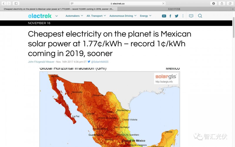 根據(jù)“electrek”的報道,日前墨西哥能源部2.3吉瓦/5.5TWh(55億度, 2020年入網(wǎng))光伏采購競標結果日前出爐,意大利ENEL綠色電力公司報價1.77美分/kWh(相當于人民幣0.11元/kWh),刷新不久前沙特阿拉伯1.79美分/kWh的光伏報價最低紀錄。文章認為,2019年可能會出現(xiàn)1美分/kWh(相當于人民幣7分/kWh)的報價。