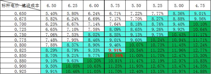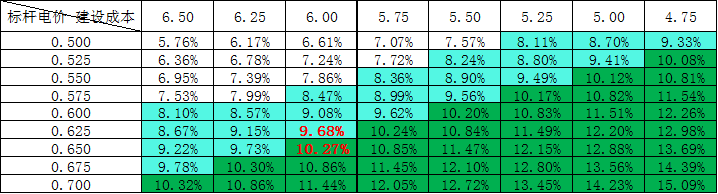 表:二類地區(qū)(1250小時)在不同建設成本時的全投資項目收益率