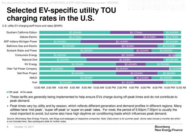 (美國部分電廠針對電動汽車推出的分時電價:峰時時段普遍包括下午4點(diǎn)到下午6點(diǎn))