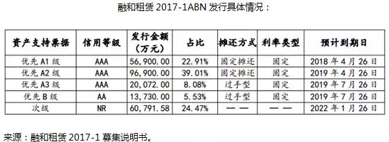 截至2017年4月1日,資產(chǎn)池的初始本金金額為25.60億元,未償本金金額為24.84億元。最大的單筆基礎(chǔ)資產(chǎn)剩余未償租金占比為14.90%,最大的單個(gè)客戶剩余未償租金占比為14.90%,因此沒(méi)有個(gè)別大戶租賃資產(chǎn)占比較高的現(xiàn)象。