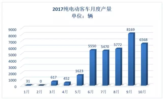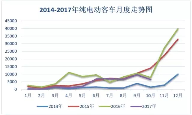 從2014-2017年純電動(dòng)客車月度走勢(shì)對(duì)比圖可看出,今年純電動(dòng)客車走勢(shì)圖和往年差別不大,6-10月份的走勢(shì)和2016年頗為相似,因此今年純電動(dòng)客車能否像2016年一樣在最后兩個(gè)月爆發(fā)則成了懸念。而且新能源補(bǔ)貼政策或在年底迎來新一輪的調(diào)整,且傳言退坡幅度更大,要求也更為嚴(yán)格,業(yè)內(nèi)人士表示,現(xiàn)在車企都在緊鑼密鼓地爭(zhēng)取盡量多的上牌,因此在一系列因素的加持情況下,今年年底或迎來新一輪的小高峰。