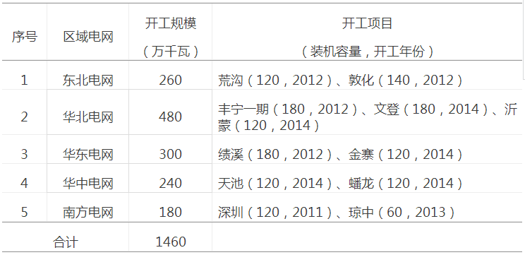 "十二五"期間,抽水蓄能電站核準(zhǔn)開工規(guī)模呈現(xiàn)明顯增長趨勢。"十二五"前四年,累計(jì)開工11座電站,總規(guī)模1460萬千瓦。特別是2014年,核準(zhǔn)開工抽水蓄能電站5座,規(guī)模660萬千瓦,創(chuàng)歷史新高。從分布來看,"十二五"前四年開工的蓄能電站主要分布在華北、華東、華中和東北電網(wǎng),南方電網(wǎng)相對較少。