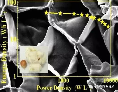 儲(chǔ)能材料的微觀結(jié)構(gòu)顯著影響著性能表現(xiàn)。微觀孔隙的設(shè)計(jì)不僅需要增加其比表面積,并且也需要供離子運(yùn)輸?shù)目焖偻ǖ?,但材料合成具有挑?zhàn)性。侯博士和他的合作者在研究報(bào)告中制備出爆米花基碳片具有 “超高”比表面積的蜂窩狀結(jié)構(gòu),獲得在生物質(zhì)碳材料中具有最高能量密度的超級(jí)電容器器件。不僅如此,該方法綠色且易加工:微波膨化爆米花8分鐘后用氫氧化鉀活化即可。