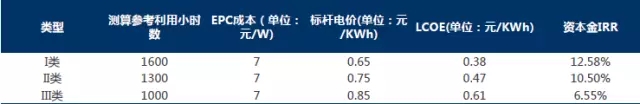 I類優(yōu)質(zhì)地區(qū),度電成本最低,約為0.38元/KWh,內(nèi)部收益率達(dá)到12.58%。