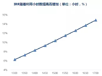 固定EPC成本,隨著利用小時數(shù)提高,內(nèi)部收益率隨之增長。例如,當(dāng)EPC成本固定為7元/W時,利用小時數(shù)平均每提升50小時,IRR約增長1%。