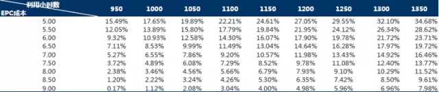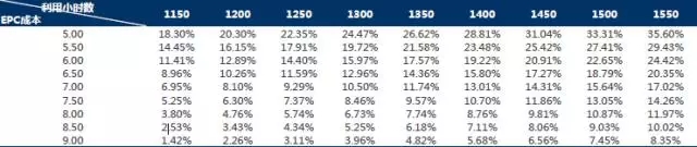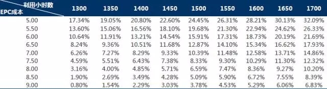 固定利用小時數(shù),隨著EPC成本提升,內(nèi)部收益率隨之下降。例如,當(dāng)利用小時數(shù)固定為1600小時數(shù)時,EPC成本越小,IRR越高。例如,當(dāng)EPC成本為5元/W時,IRR為28.21%,隨著EPC成本增長至9元/W,IRR下降至5.29%。具體如下圖所示: