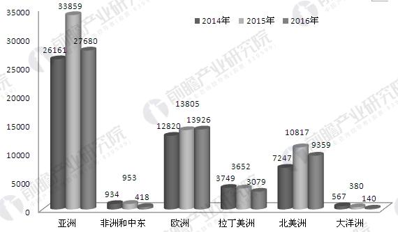 2014-2016年全球風(fēng)電新增裝機區(qū)域結(jié)構(gòu)(單位:MW)