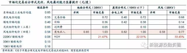 市場(chǎng)交易主要有三種模式:與電力用戶直接交易、電網(wǎng)代售、電網(wǎng)收購(gòu);分布式光伏、小規(guī)模風(fēng)電企業(yè)若參與市場(chǎng)交易,以光伏三類地區(qū)(華東、華南為例),售電價(jià)格假設(shè)為工業(yè)電價(jià)的8-9折,約為0.7元/度(工業(yè)電價(jià)假設(shè)在0.8-0.9元/度左右);補(bǔ)貼方面,三類地區(qū)上網(wǎng)電價(jià)0.85元/度,扣除脫硫脫硝電價(jià)相當(dāng)于獲得0.45-0.5元/度的補(bǔ)貼,即使打8折仍可獲得0.36元/度的補(bǔ)貼,同理小規(guī)模風(fēng)電參加市場(chǎng)化交易仍可獲得0.14元/度的補(bǔ)貼;屋頂分布式0.42元/度電打9折約合0.38元/度;過(guò)網(wǎng)費(fèi)由省級(jí)部門制定,在核定前暫按對(duì)應(yīng)電壓等級(jí)輸配電價(jià)扣減最高電壓輸配電價(jià),我們估算過(guò)網(wǎng)費(fèi)會(huì)在0.05-0.10元/度左右;