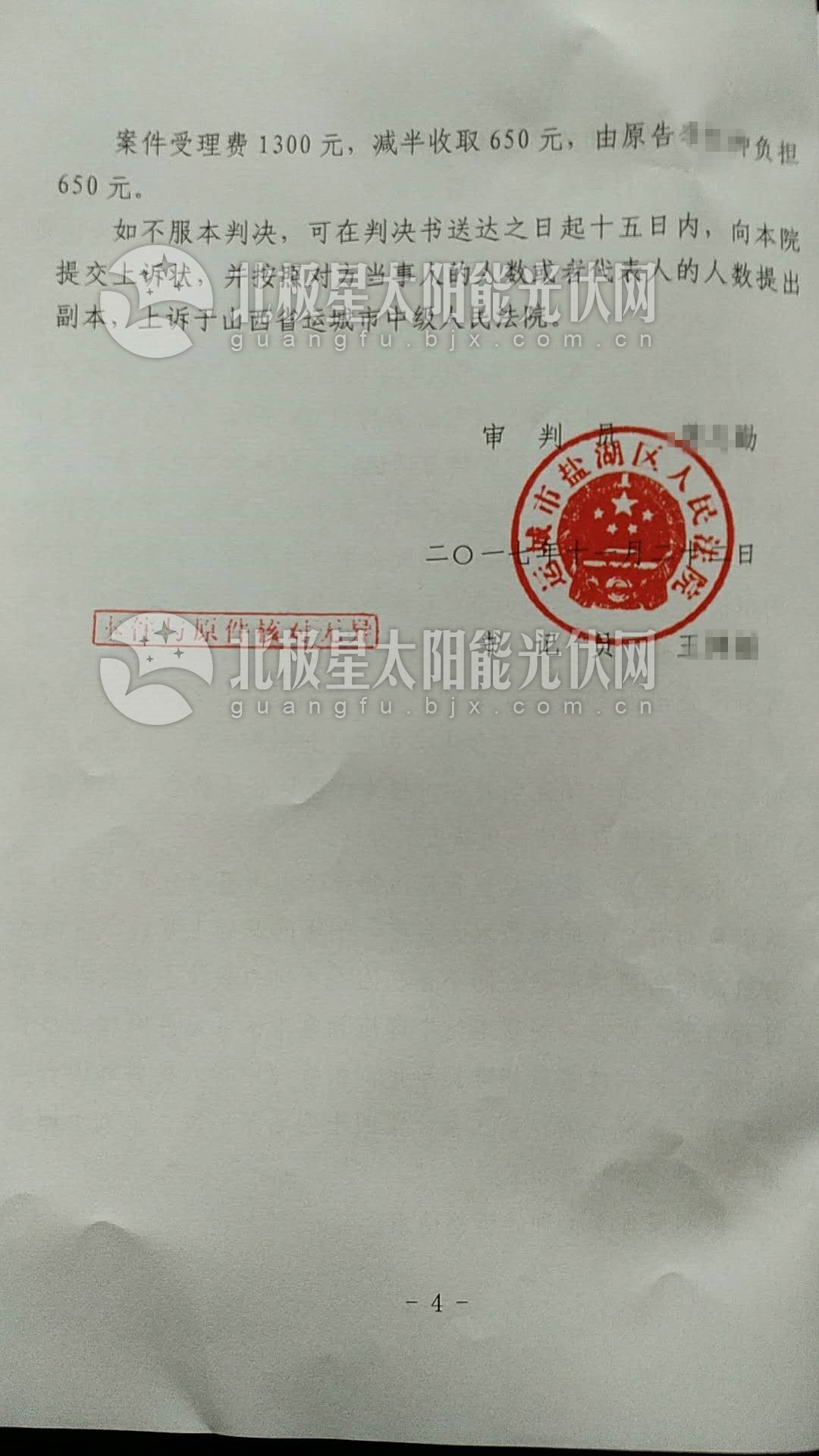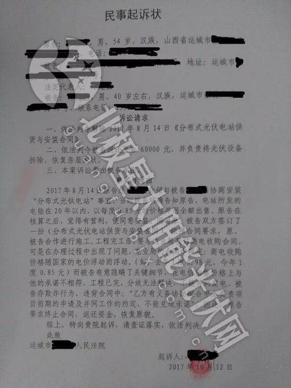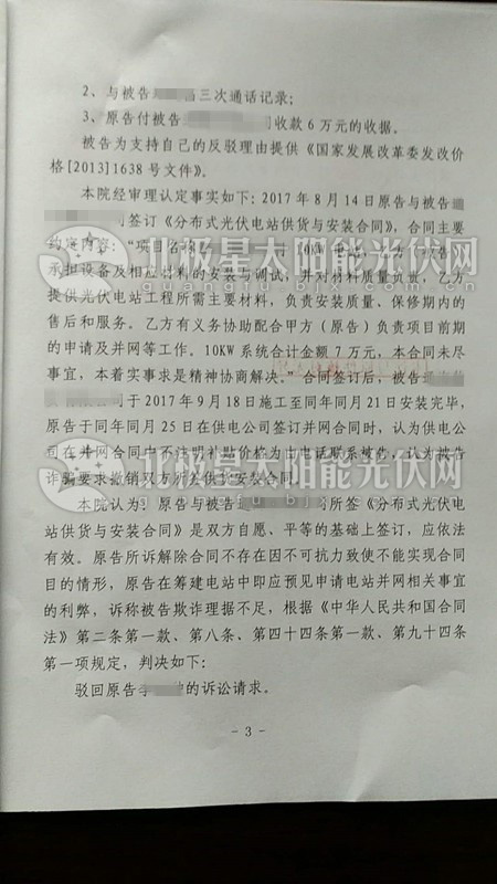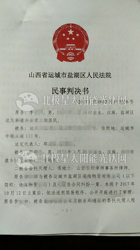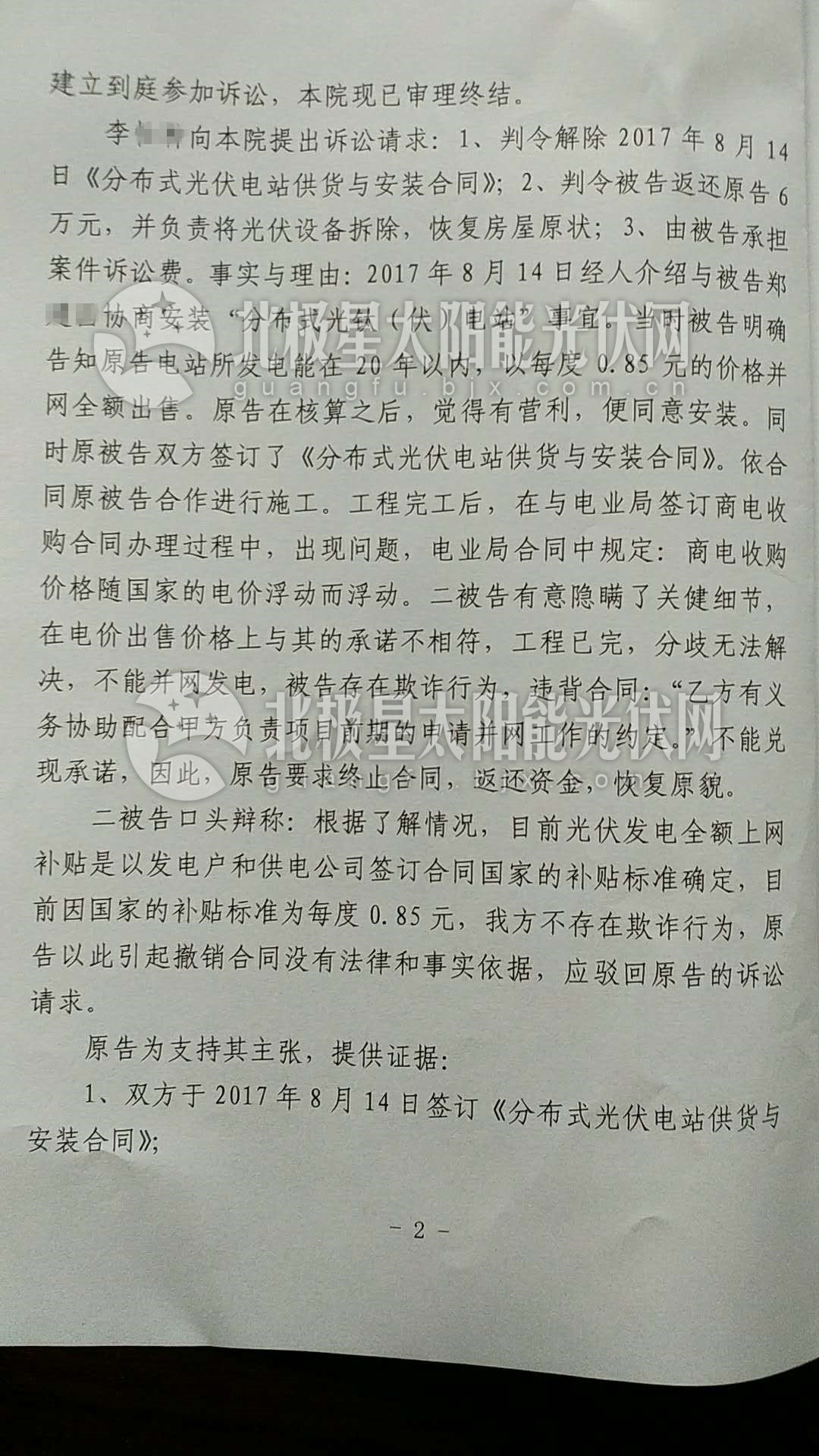 該案件的爭議和核心在于,用戶李某看到與電業(yè)局簽訂的發(fā)用電合同中沒有寫明光伏電價補(bǔ)貼標(biāo)準(zhǔn)事宜,“聽說0.85元的度電補(bǔ)貼會隨著國家政策的調(diào)整而變化,并不能保證20年不變,心生顧慮才反悔。”因此,李某將光伏經(jīng)銷商鄭某以欺詐理由告上了山西運(yùn)城鹽湖區(qū)人民法院。(可參考此前報(bào)道《一紙傳票,山西某光伏經(jīng)銷商被告上法庭!》)