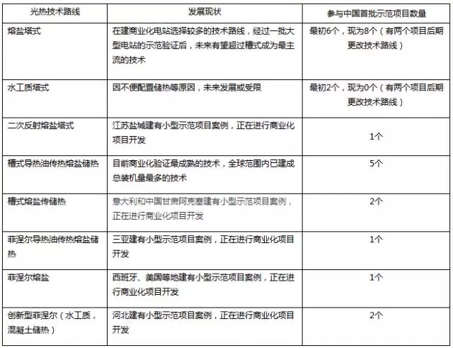 共10余種細(xì)分技術(shù)路線參與了首批示范項(xiàng)目申報(bào),其中不乏一些創(chuàng)新型技術(shù)方案。最終入選的共有熔鹽塔式、水工質(zhì)塔式、二次反射熔鹽塔式、槽式導(dǎo)熱油傳熱熔鹽儲(chǔ)熱、槽式熔鹽傳儲(chǔ)熱、菲涅爾導(dǎo)熱油傳熱熔鹽儲(chǔ)熱、菲涅爾熔鹽傳儲(chǔ)熱、創(chuàng)新型菲涅爾(水工質(zhì)加混凝土儲(chǔ)熱)等八種技術(shù)路線入選。