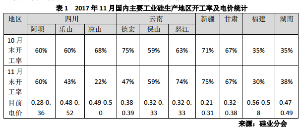 2017年11月我國開工率小幅下調(diào)。根據(jù)硅業(yè)分會統(tǒng)計,截至11月底新疆、云南、四川三大主產(chǎn)區(qū)開工率如下:新疆開工率維持在75%;云南怒江、德宏、保山開工率分別為74%、47%、59%;四川阿壩、樂山、涼山開工率分別為60%、43%、22%。云南德宏以及四川涼山、樂山地區(qū)開工率較10月末出現(xiàn)不同程度回落,云南德宏開爐數(shù)已從11月初的41臺爐下降至月底的28臺爐;11月25日四川涼山、樂山地區(qū)正式進入枯水季節(jié),電價上調(diào)后大部分工廠進入停爐檢修期。11月底四川涼山、樂山枯水期電價上調(diào)至0.49-0.52元/度;云南地區(qū)枯水期電價預(yù)計將于12月出臺,屆時怒江、德宏、保山開工率將進一步走低。