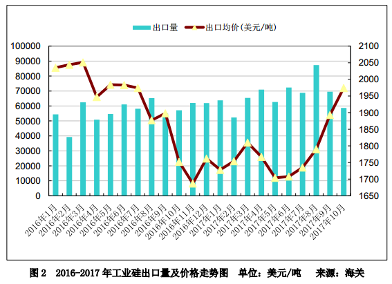 2017年10月,我國工業(yè)硅出口量5.8萬噸,同比上漲1.7%,環(huán)比下降15.9%;出口均價1974美元/噸,同比上漲12.6%,環(huán)比上漲4.3%。1-10月累計出口工業(yè)硅67.2萬噸,同比上升20.4%;出口均價1786美元/噸。