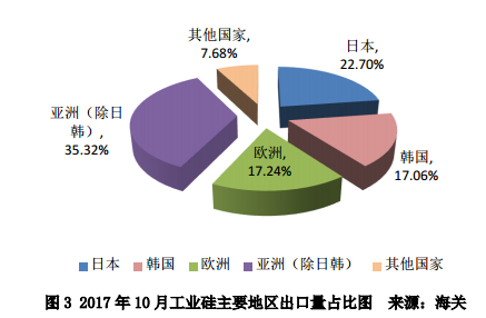 如圖所示,2017年10月對日出口1.32萬噸,占出口總量的22.7%;對韓出口1.00萬噸,占出口總量的17.1%;對歐出口1.01萬噸,占出口總量的17.2%;對除日韓外亞洲地區(qū)出口工業(yè)硅2.07萬噸,占出口總量35.3%。