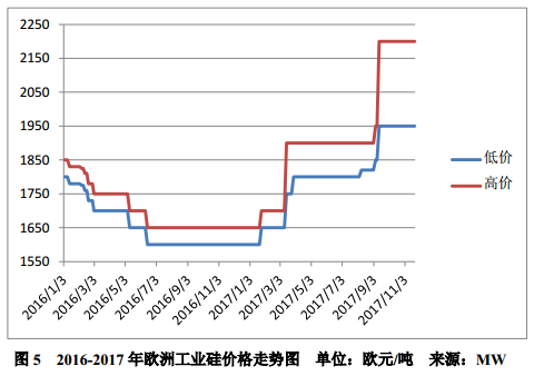 2017年11月歐洲工業(yè)硅主流均價為2075歐元/噸,同比上升27.6%,環(huán)比持平。截止11月27日,歐洲主流工業(yè)硅價格為1950-2200歐元/噸,較2017年初上漲450歐元/噸。