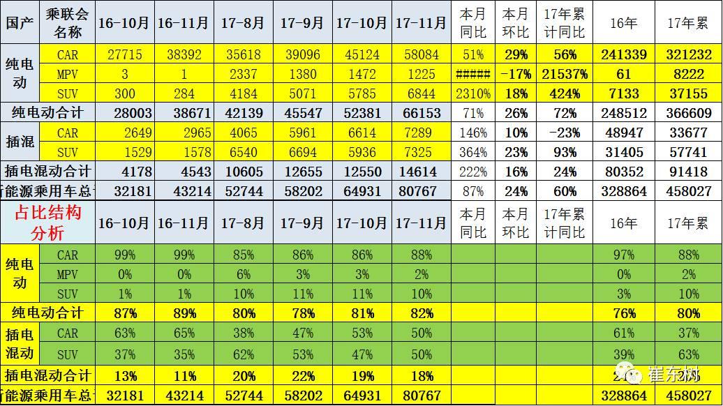 在總體中國乘用車市場走勢年初高、隨后持續(xù)下行到夏季谷底的正常走勢下,新能源乘用車呈現(xiàn)頑強(qiáng)的月度環(huán)比向上趨勢。17年新能源乘用車保持連續(xù)10個(gè)月的月度環(huán)比持續(xù)增長態(tài)勢,從1月的0.65萬起步,2月環(huán)比增1.1萬臺、3月1.1萬,4月0.2萬、5月0.9萬、6月0.3萬、7月0.2萬,8月0.9萬,9月0.5萬,10月0.7萬,11月1.6萬,最終增長到8.07萬。