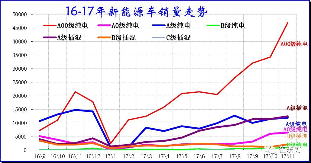 目前的純電動(dòng)A00級車成為車市的絕對主力車型,增長表現(xiàn)突出,而16年A級電動(dòng)車表現(xiàn)也較強(qiáng),雖然17年9月調(diào)整,但10-11月仍較快穩(wěn)定并恢復(fù)。