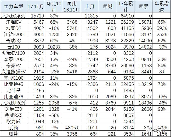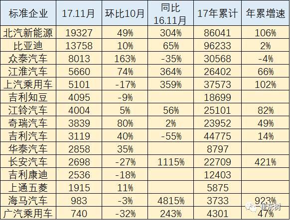 17年11月的新能源車廠家銷量分化。部分新勢力新能源企業(yè)表現(xiàn)較強(qiáng),16年11月主力企業(yè)銷量收縮。而17年的北汽、比亞迪都是很努力增量,眾泰去年11月就很強(qiáng),今年仍是很強(qiáng)。江淮的新能源也是提升很猛。