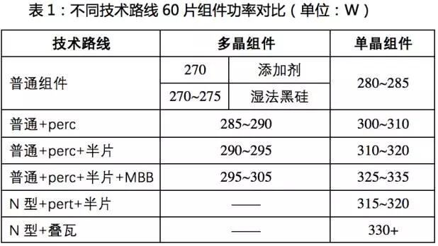 傳統(tǒng)普通多晶組件功率為270W,普通單晶組件功率為285W,功率差為15W;當各自疊加一系列新技術以后,功率差會進一步拉大。2018年各種技術路線的組件功率分布如表1所示。
