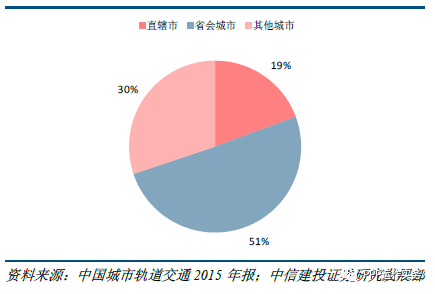 圖1:2015年底中國(guó)城軌在建里程按城市類型分類占比