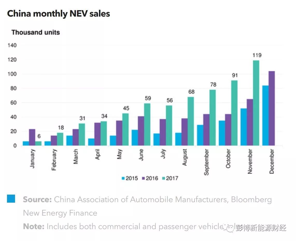 如果明年實(shí)際的補(bǔ)貼調(diào)整和流傳的方案一致,那么12月份的銷量有望再創(chuàng)新高。但明年一季度的銷量將再次回落,因?yàn)橹醒牒偷胤秸匦聦彾ㄐ律蠄筌囆偷难a(bǔ)貼額度。而后續(xù)幾個季度銷量將有所回升。預(yù)計中國明年新能源車銷量將沖擊100萬輛大關(guān)。這幾乎相當(dāng)于2017年全球所有新能源乘用車銷量的總和。