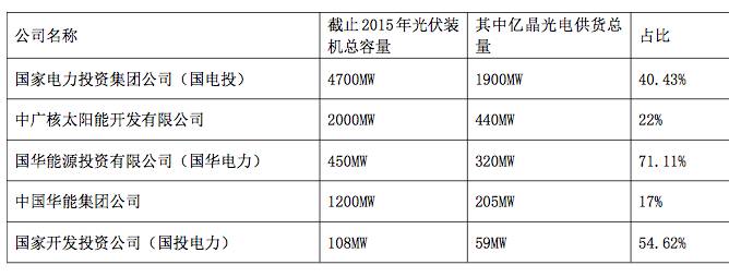 根據(jù)億晶的一份宣傳材料,億晶在央企采購(gòu)的光伏組件占有率較高。截止2015年,億晶在幾家央企的市場(chǎng)份額數(shù)據(jù)如下表。