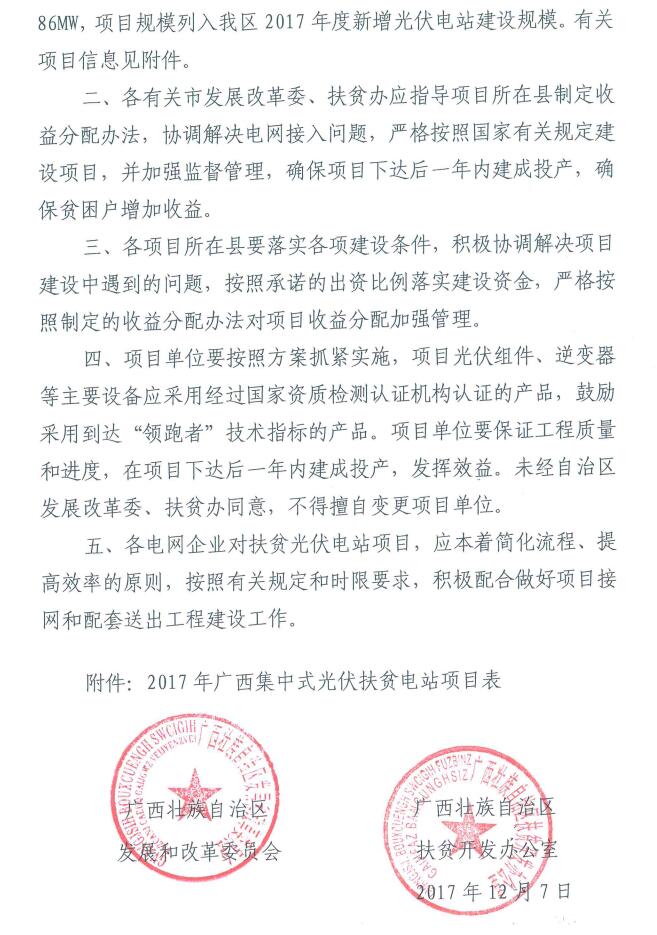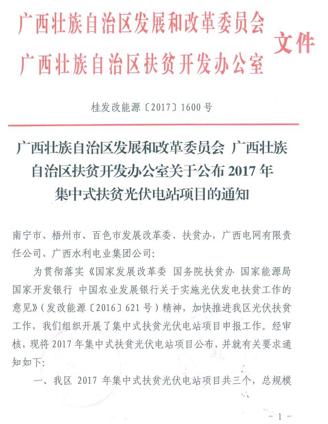 中國儲(chǔ)能網(wǎng)訊:12月14日,廣西壯族自治區(qū)發(fā)展和改革委員會(huì)廣西壯族自治區(qū)扶貧開發(fā)辦公室公開發(fā)布了《關(guān)于公布2017年集中式扶貧光伏電站項(xiàng)目的通知 (桂發(fā)改能源〔2017〕1600號(hào))》,詳細(xì)文件如下: