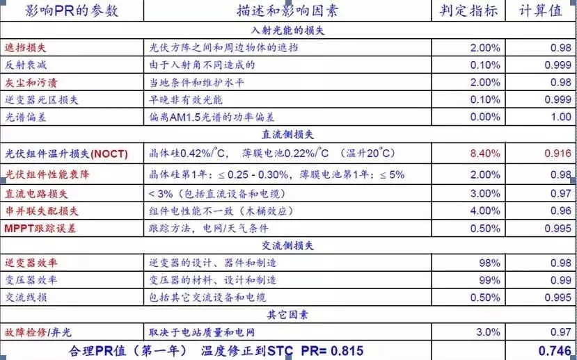 王斯成老師在《光伏系統(tǒng)的評(píng)價(jià)指標(biāo)》中,將影響PR的因素總結(jié)為14項(xiàng),詳見下表。