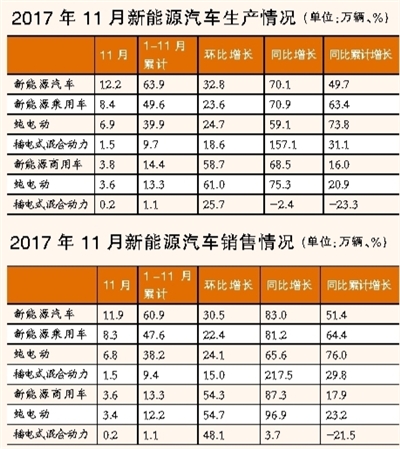 中國儲能網(wǎng)訊:中國汽車工業(yè)協(xié)會(huì)(簡稱“中汽協(xié)”)12月11日發(fā)布的數(shù)據(jù)顯示,11月,新能源汽車產(chǎn)銷分別完成12.2萬輛和11.9萬輛,環(huán)比分別增長32.8%和30.5%,同比分別增長70.1%和83%。中汽協(xié)秘書長助理許海東在現(xiàn)場預(yù)測,“今年完成新能源汽車70萬輛的銷售目標(biāo)肯定沒問題,2018年的新能源汽車銷量有望破百萬。”