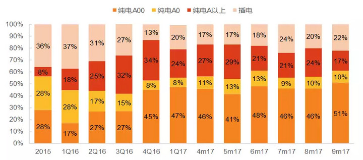 詳細(xì)拆分近三年新能源乘用車銷量數(shù)據(jù)我們會(huì)發(fā)現(xiàn),A00級(jí)小車銷量占比極高,今年前十個(gè)月,A00級(jí)小車銷量占比超過50%。而包含燃油車在內(nèi)的乘用車總銷量結(jié)構(gòu)中,占比最高的為A級(jí)車,約60%,A00級(jí)車占比不足2%。對(duì)比之下不難發(fā)現(xiàn),現(xiàn)有新能源乘用車銷量結(jié)構(gòu)十分不合理。在補(bǔ)貼政策引導(dǎo)和主流車企發(fā)力的雙重作用下,未來新能源汽車市場(chǎng)結(jié)構(gòu)將與傳統(tǒng)燃油車銷量結(jié)構(gòu)趨同。