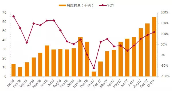 每年年底和次年年初,都是行業(yè)最悲觀的時(shí)刻,但回首2015-2017,基本每年銷量目標(biāo)都能順利完成。根據(jù)中汽協(xié)數(shù)據(jù),2015年總銷量超30萬輛,2016年總銷量超50萬輛,今年前10個(gè)月累計(jì)銷量48.6萬輛,距離完成70萬輛的目標(biāo)僅一步之遙。因此,我們有理由相信,明年100萬的總銷量目標(biāo)也能順利完成。