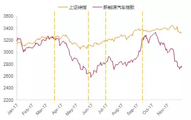 圖7:年初至今的上證綜指、新能源汽車指數(shù)走勢(shì)(2017.1.3-2017.12.1)