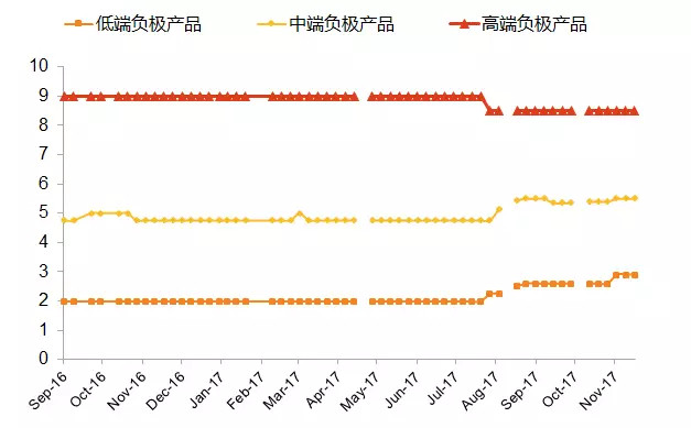17年初開始,由于補(bǔ)貼下降和產(chǎn)能過剩,動(dòng)力電池進(jìn)入降價(jià)通道,上半年動(dòng)力電池均價(jià)對(duì)比16年下降20%以上。而在上游,碳酸鋰和鈷價(jià)持續(xù)高漲。上下游壓力的傳導(dǎo)集中在中游體現(xiàn),導(dǎo)致中游電池材料價(jià)格出現(xiàn)明顯分化。三元正極材料價(jià)格全年上漲,而磷酸鐵鋰正極材料、隔膜、電解液價(jià)格都出現(xiàn)明顯下滑,負(fù)極材料則在上半年的下滑后由于原材料針狀焦的拉動(dòng)在下半年出現(xiàn)漲價(jià)。中游價(jià)格的波動(dòng)與分化也對(duì)產(chǎn)業(yè)鏈帶來極大影響,正極材料對(duì)于鋰鈷、電池企業(yè)對(duì)于原材料的掌控能力差異成為競(jìng)爭(zhēng)的重要?jiǎng)儇?fù)手。
