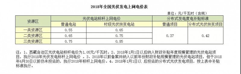 2018年1月1日以后投運(yùn)的、采用“自發(fā)自用、余量上網(wǎng)”模式的分布式光伏發(fā)電項(xiàng)目,全電量度電補(bǔ)貼標(biāo)準(zhǔn)降低0.05元,即補(bǔ)貼標(biāo)準(zhǔn)調(diào)整為每千瓦時(shí)0.37元(含稅)。采用“全額上網(wǎng)”模式的分布式光伏發(fā)電項(xiàng)目按所在資源區(qū)光伏電站價(jià)格執(zhí)行。